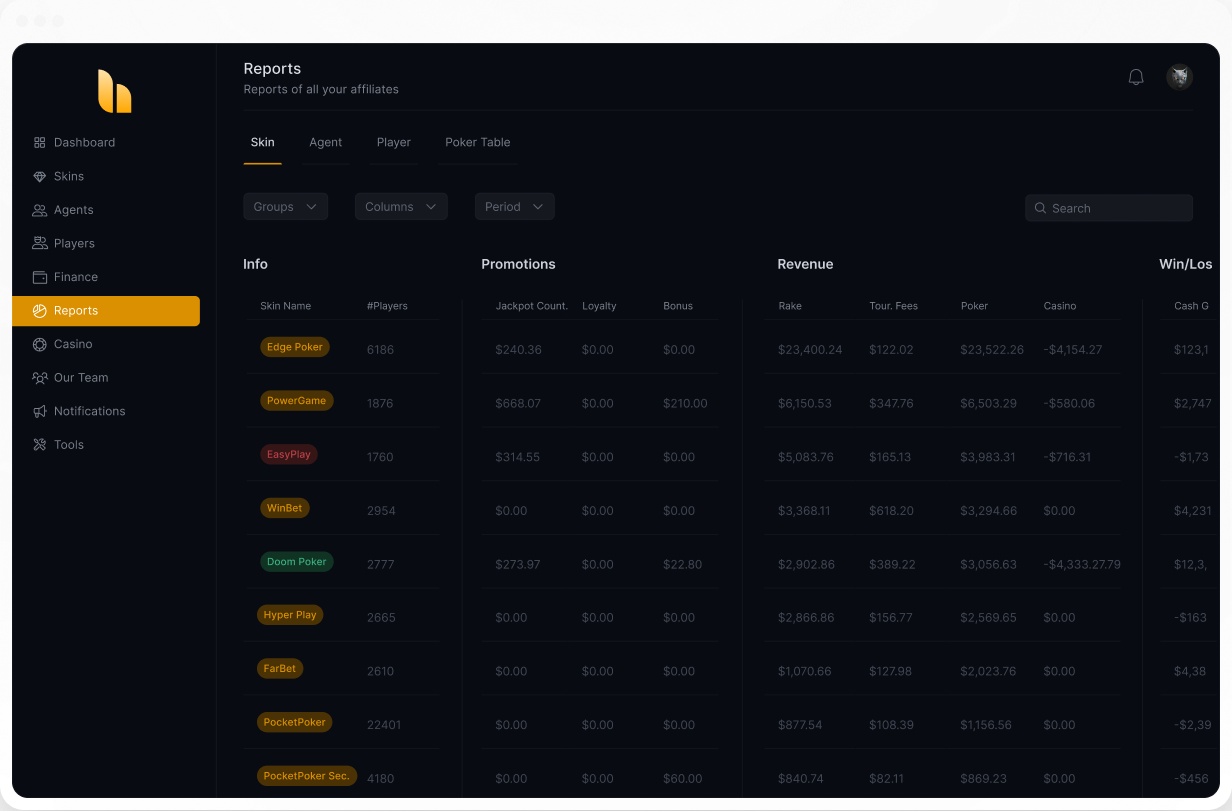 Managing your structure, tracking transactions, and generating reports shouldn't be this complex. Are manual tasks and scattered systems slowing you down? If handling skins, agents, and players feels inefficient, it's time for a platform that streamlines operations, keeps clients satisfied, and lets you focus on revenue-driving activities.